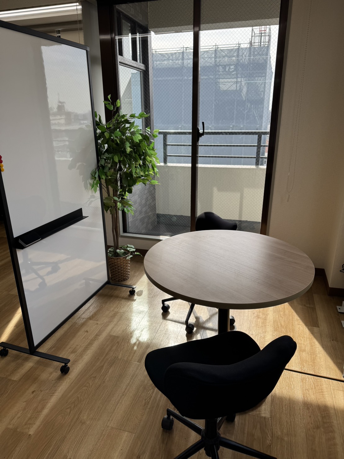 そこで昨年作ったのが写真のカフェ風スペースなのですが、面談やオンライン訓練といったスタッフが使う場所となってしまい、本来考えていた、利用者さんの休憩や団らんスペースにはならず・・・。