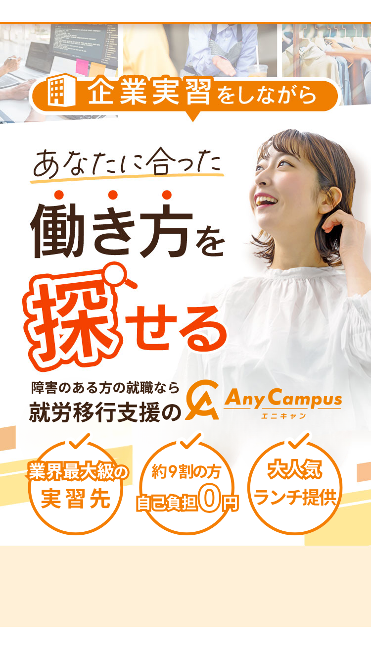 AnyCampus(エニキャン)では、障がい特性の理解や希望に沿った職場環境の確認を、実習を通して体験することが出来ます。
